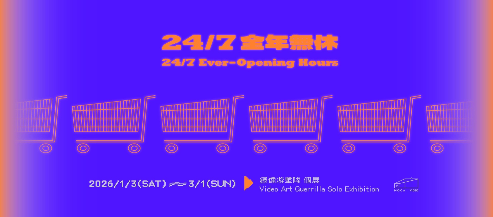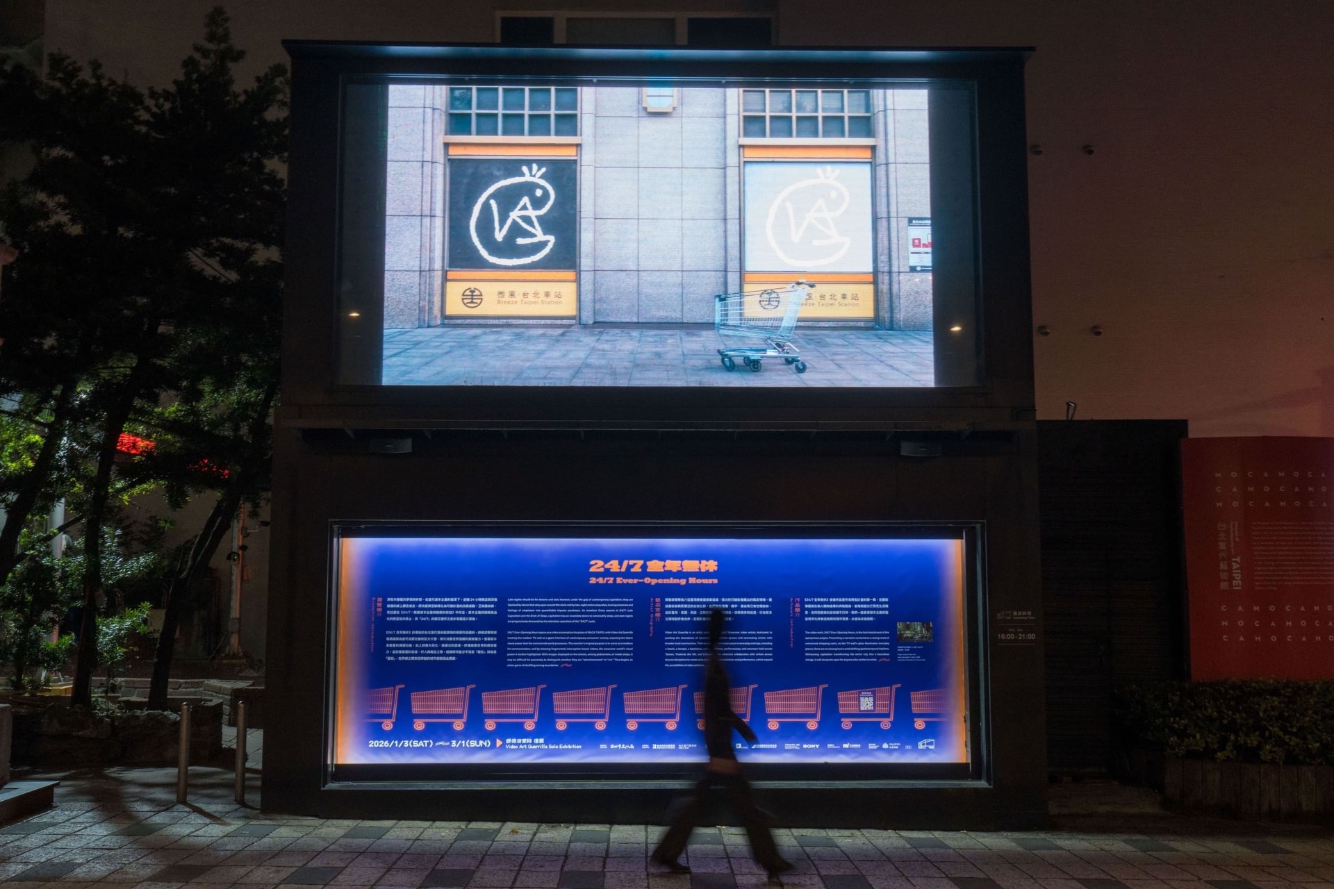 24/7 Ever-Opening Hours opens as a video screened on the plaza of MoCA TAIPEI, with Video Art Guerrilla treating the outdoor TV wall as a giant interface of contemporary consumer society, exposing the latent visual power that the commercial world possesses. The monitor's original purpose is to serve as a medium for communication, and by showing fragmented, interruption-based videos, the consumer world's visual power is further highlighted. With images displayed on the streets, among pedestrians, or inside shops, it may be difficult for passersby to distinguish whether they are "advertisements" or "art." Thus begins an urban game of shuffling between boundaries.