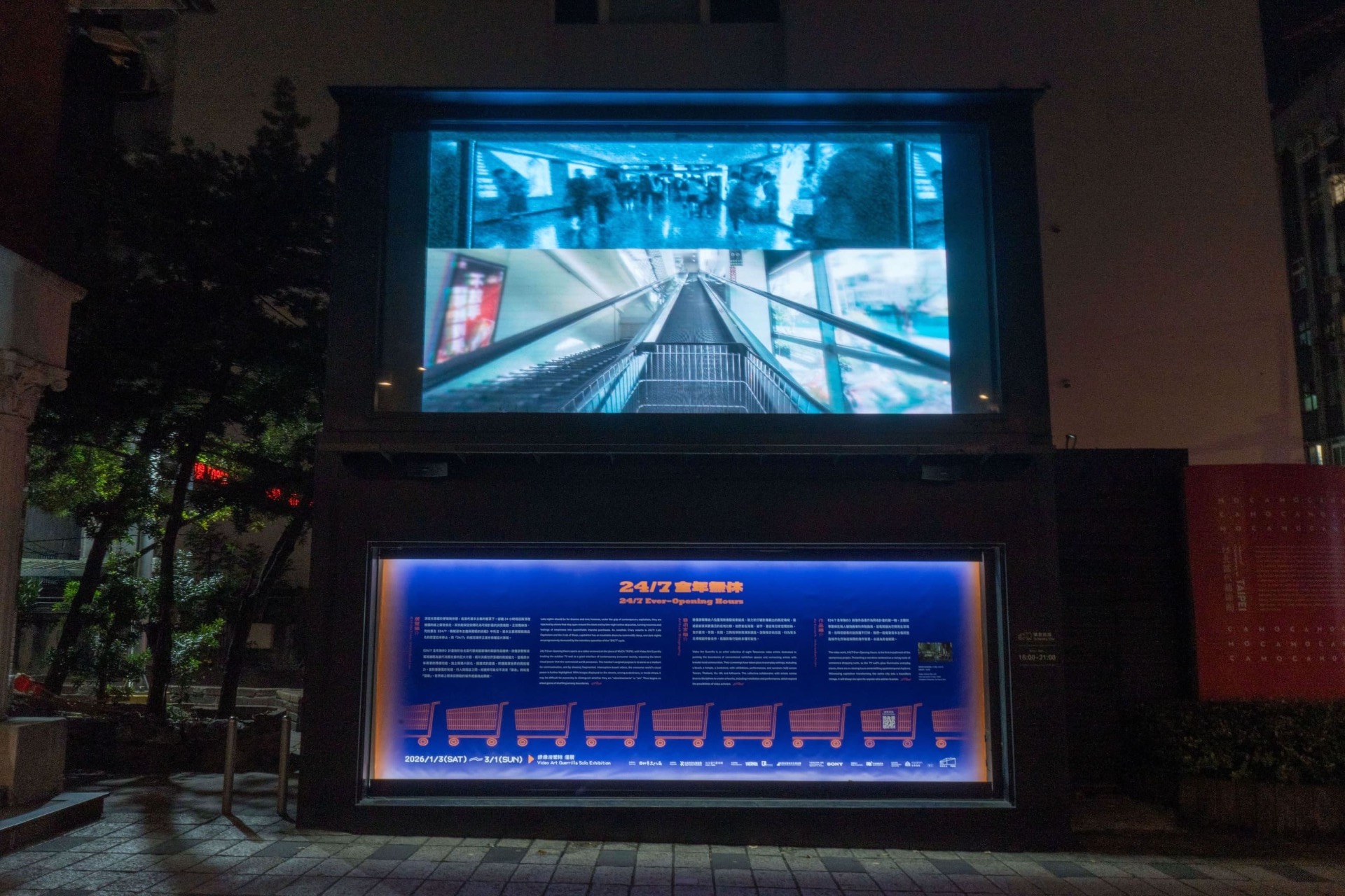 The video work, 24/7 Ever-Opening Hours, is the first installment of the eponymous project. Presenting a narrative centered on a racing route of unmanned shopping carts, as the TV wall's glow illuminates everyday places, there are no closing hours amid shifting spatiotemporal rhythms. Witnessing capitalism transforming the entire city into a boundless mirage, it will always be open for anyone who wishes to enter.